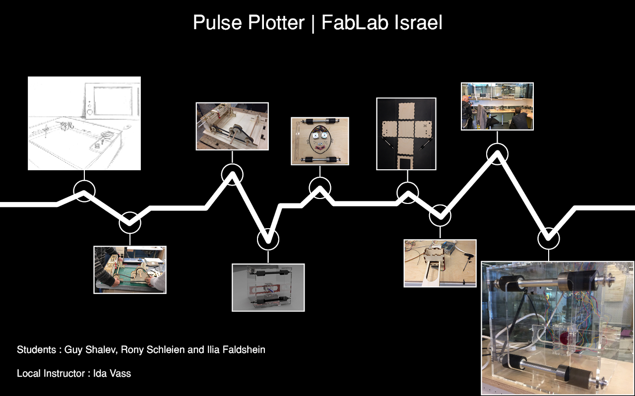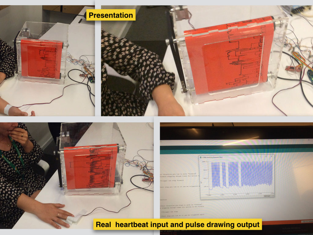 The machine we managed to build translates the analog infromation acquired from a heartbeat sensor into a left to right movement of a step motor. Another motor scrolles a whiteboard paper in endless loop and an erasable marker draws the pulse wave on the whiteboard paper loop like a monitor screen.