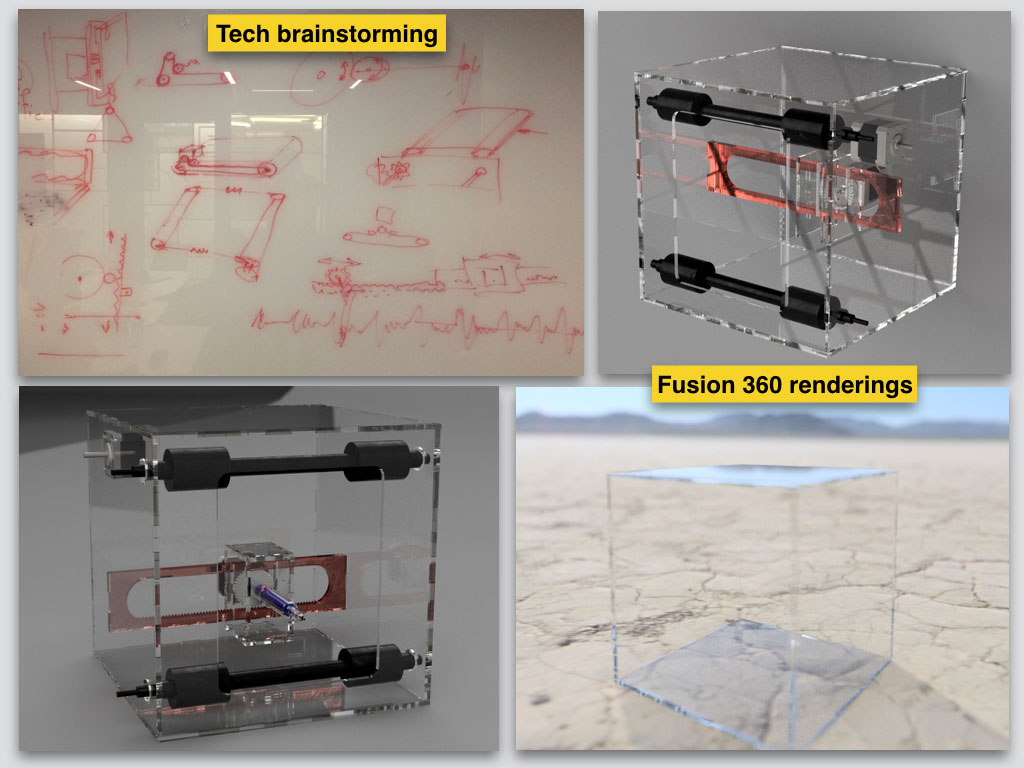 Transparent Plexiglass monitor structure used to hold all the rigid + metal parts and to expose the inside mechanism.