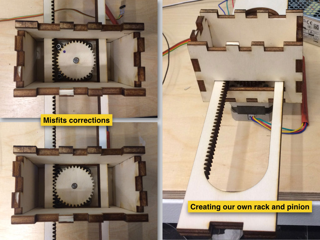 We created our own design of rack and pinion which worked fine. Of course the first version the sliding box with the motor went not smooth and we needed to get rid of the tension which caused by pen motor weight on the rack. We solved that with balance by spreading the weight of pinion and motor slide carriage from both of the sides of the rack.