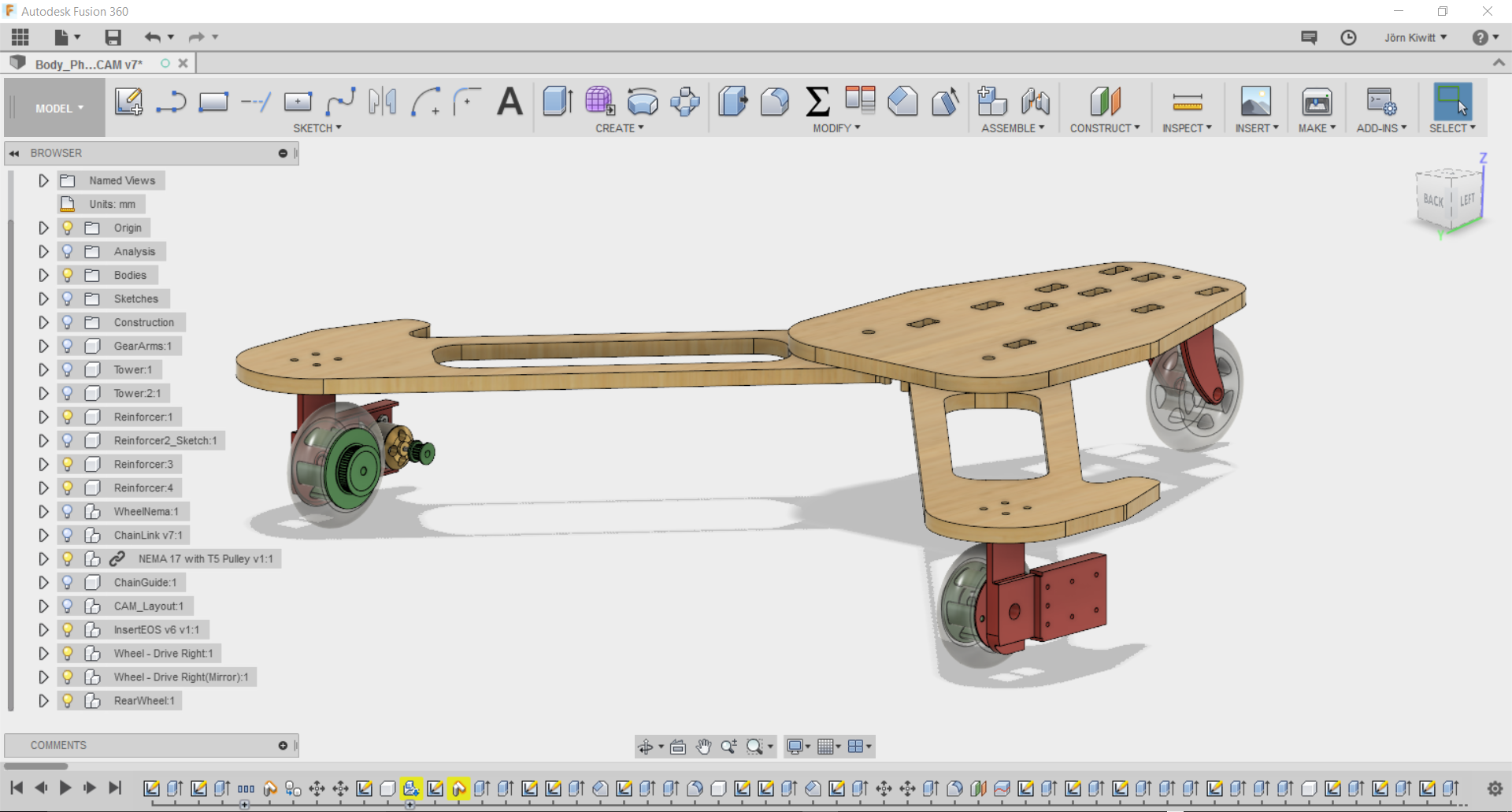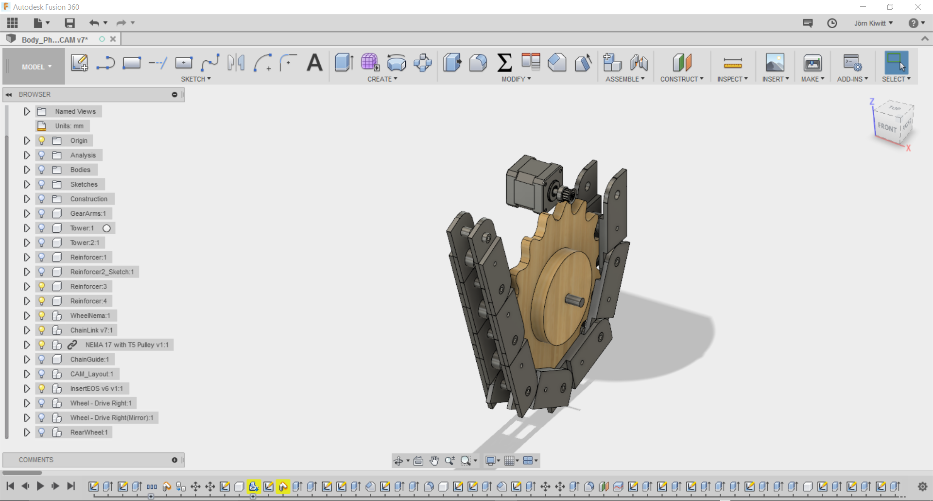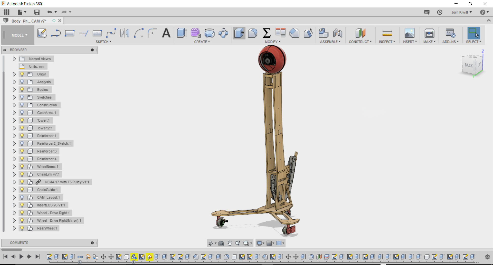 Obviously, my design has gone through a lot of iterations, but the basic idea is the same. A robot, that takes pictures of a scene from different perspectives controlled via a smartphone, that gives you live images, control the trigger for the camera and drive the robot around. The height and pitch angle of the camera can be adjusted as well, using servos and a stepper motor that drives a push chain.