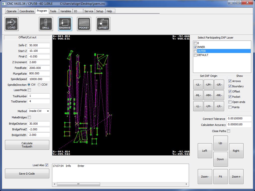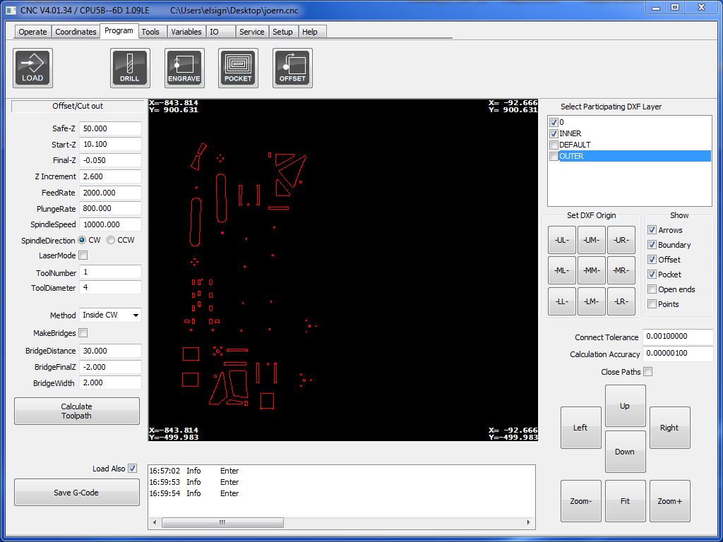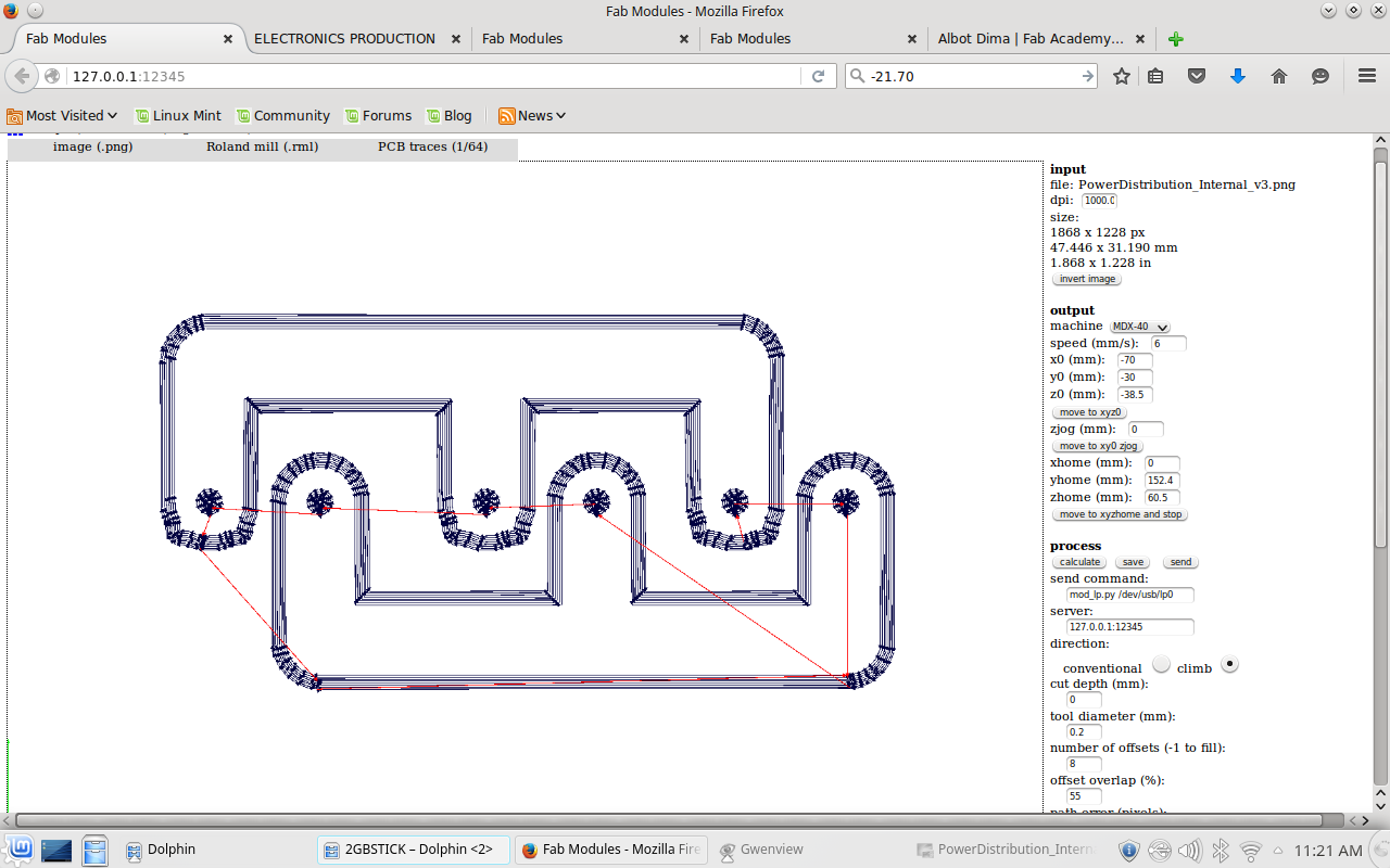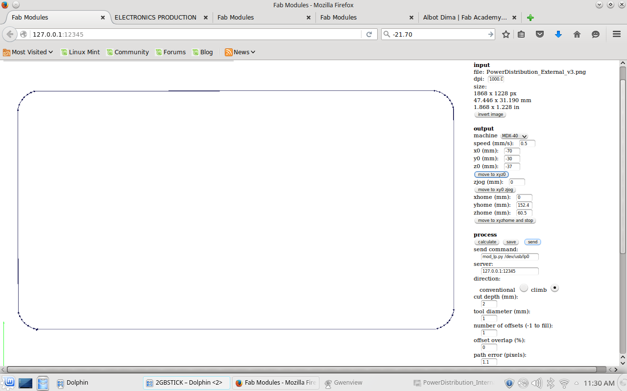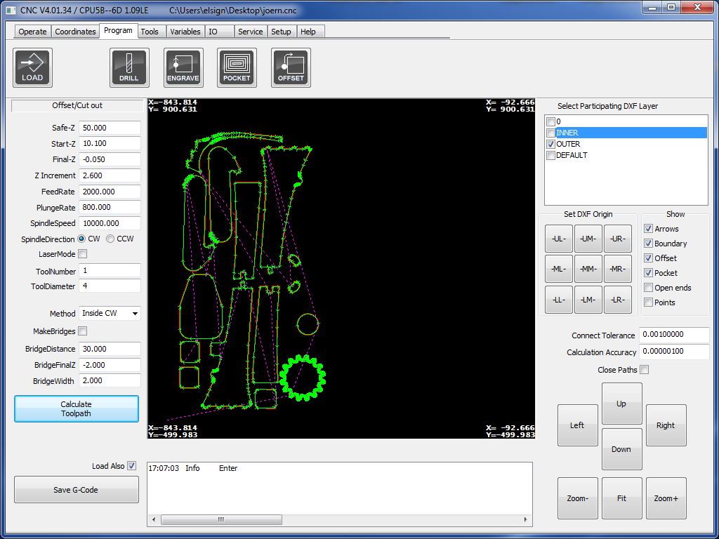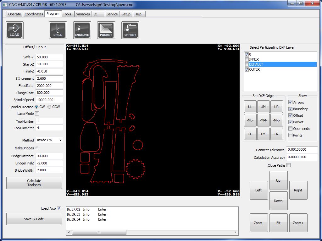 I made the frame using the EasyWorker CNC machine which I used earlier in the make something big assignment. All parts were laid flat using the align function in Fusion, projected a single sketch which was then exported to as *.dxf-file. Again, I took some tweaking in Rhino playing the explode and join function to account for all the doubles. I added to layers for the internal and the external cut and opened the file on the CNC machine. All settings can be retrieved from following images. Materialwise, I used MDF of 10 mm thickness.