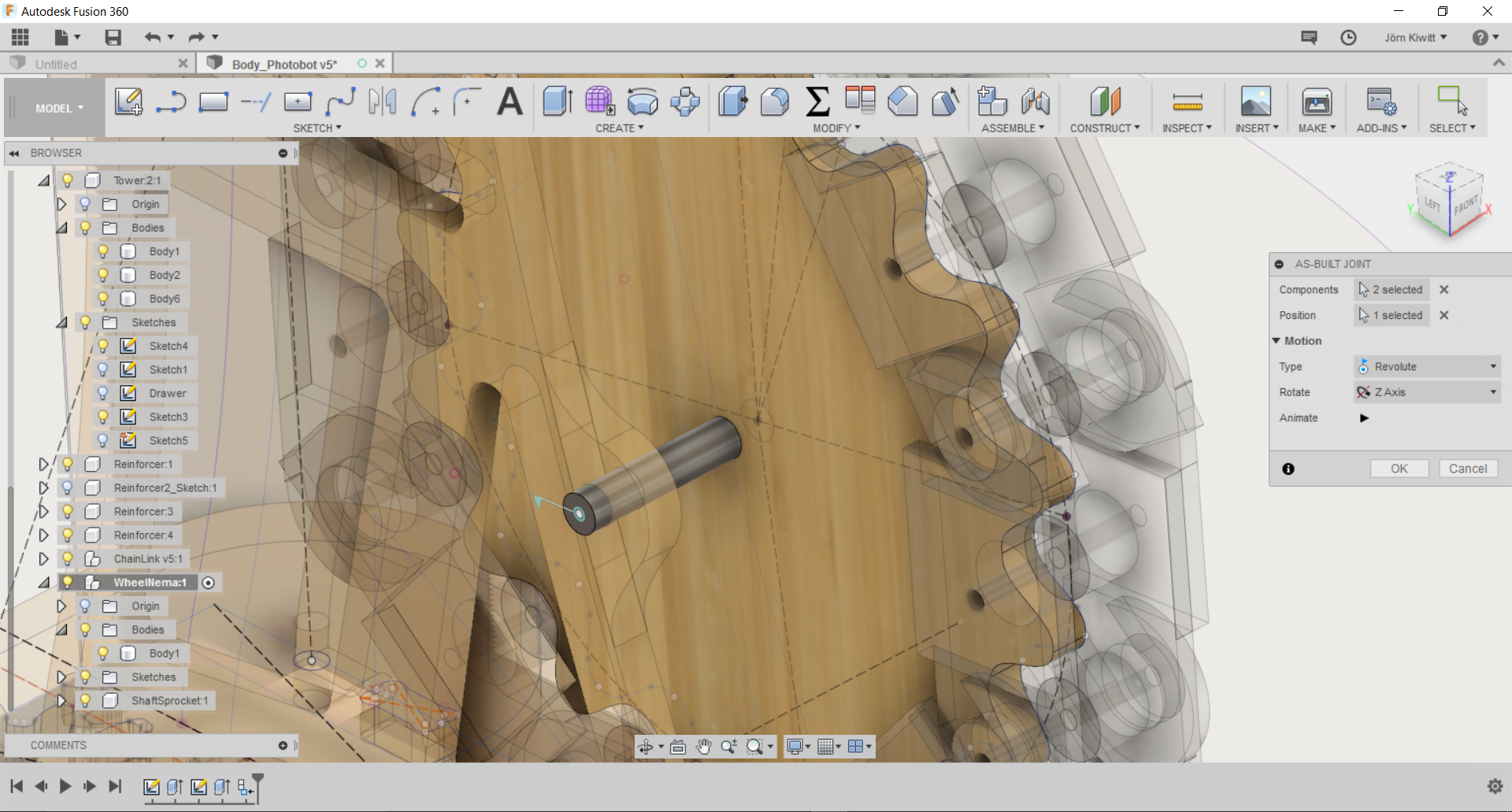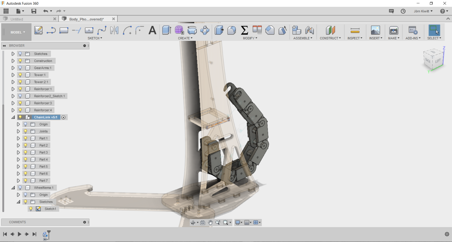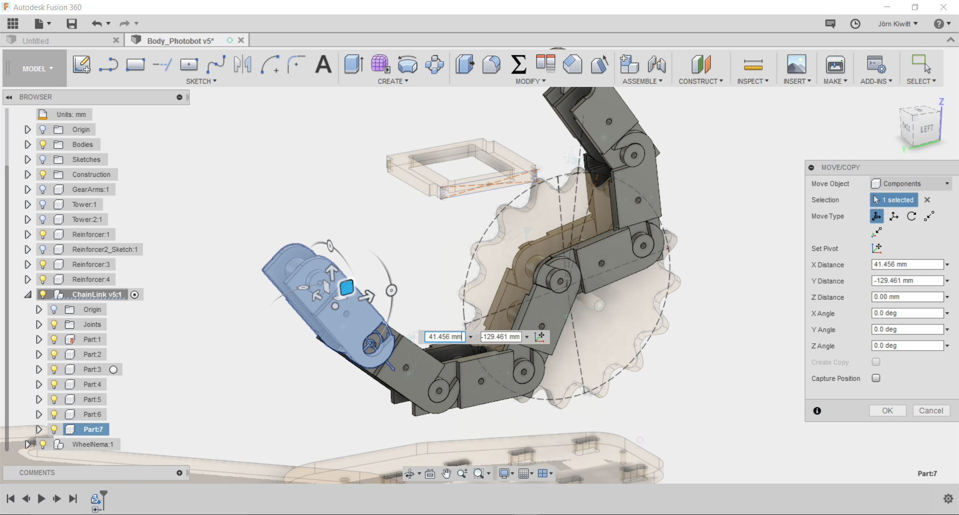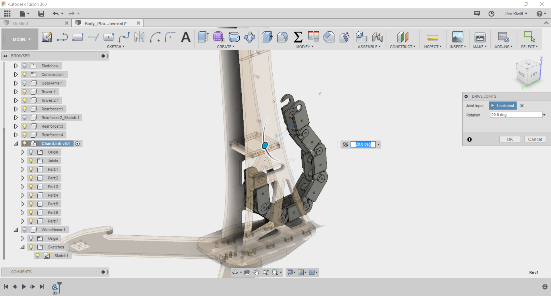 It turned out that a real chain movement is not easy realize in Fusion. If you see chain running, these often follow given functions, so I did not spend further effort fitting it. Still, I arranged the chain in a way that it could be pushed by a sprocket.