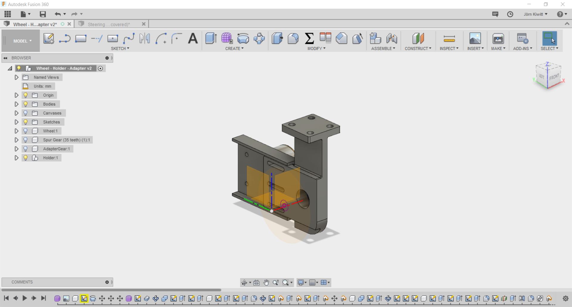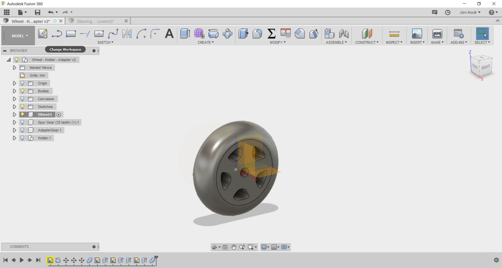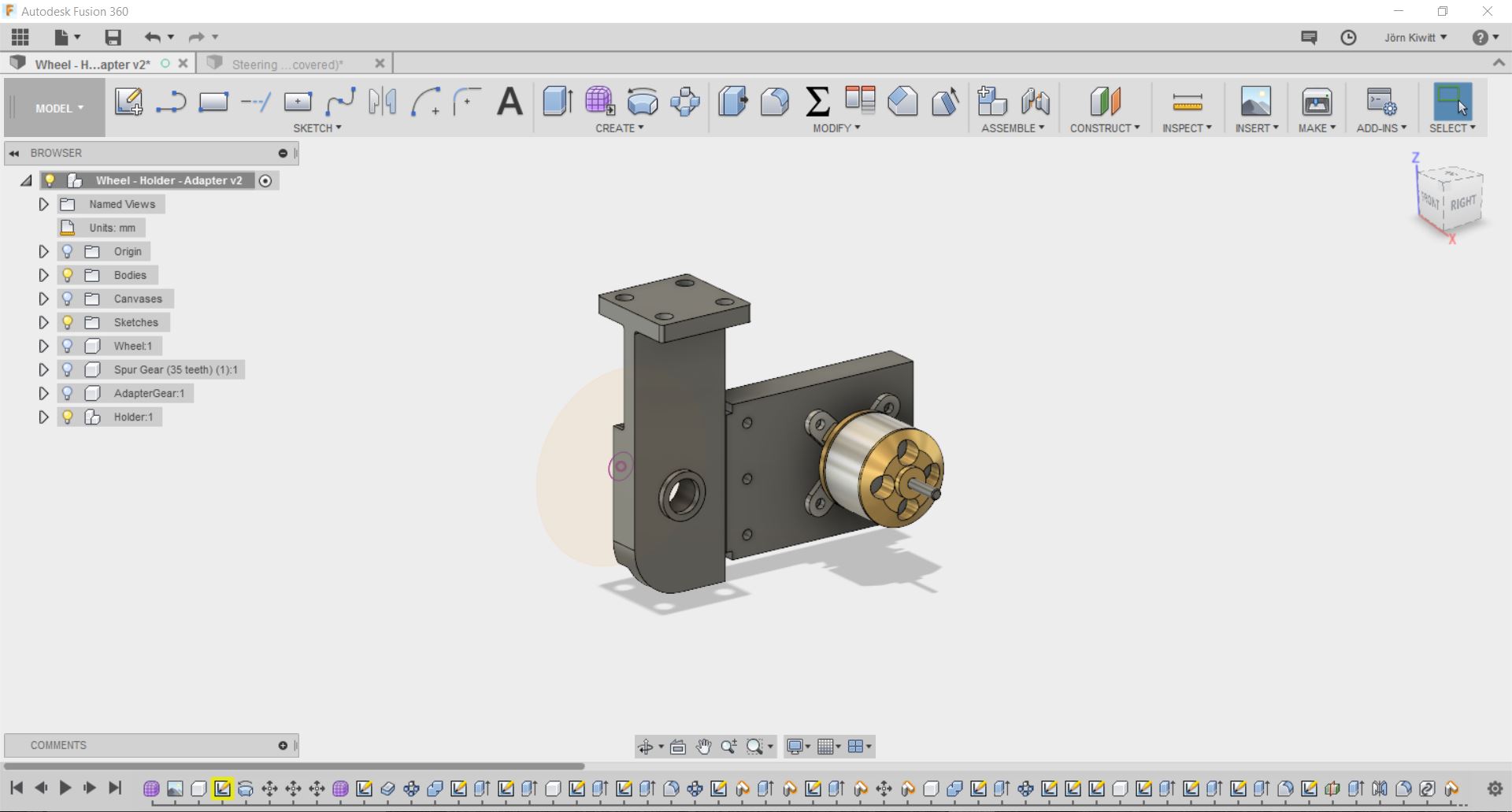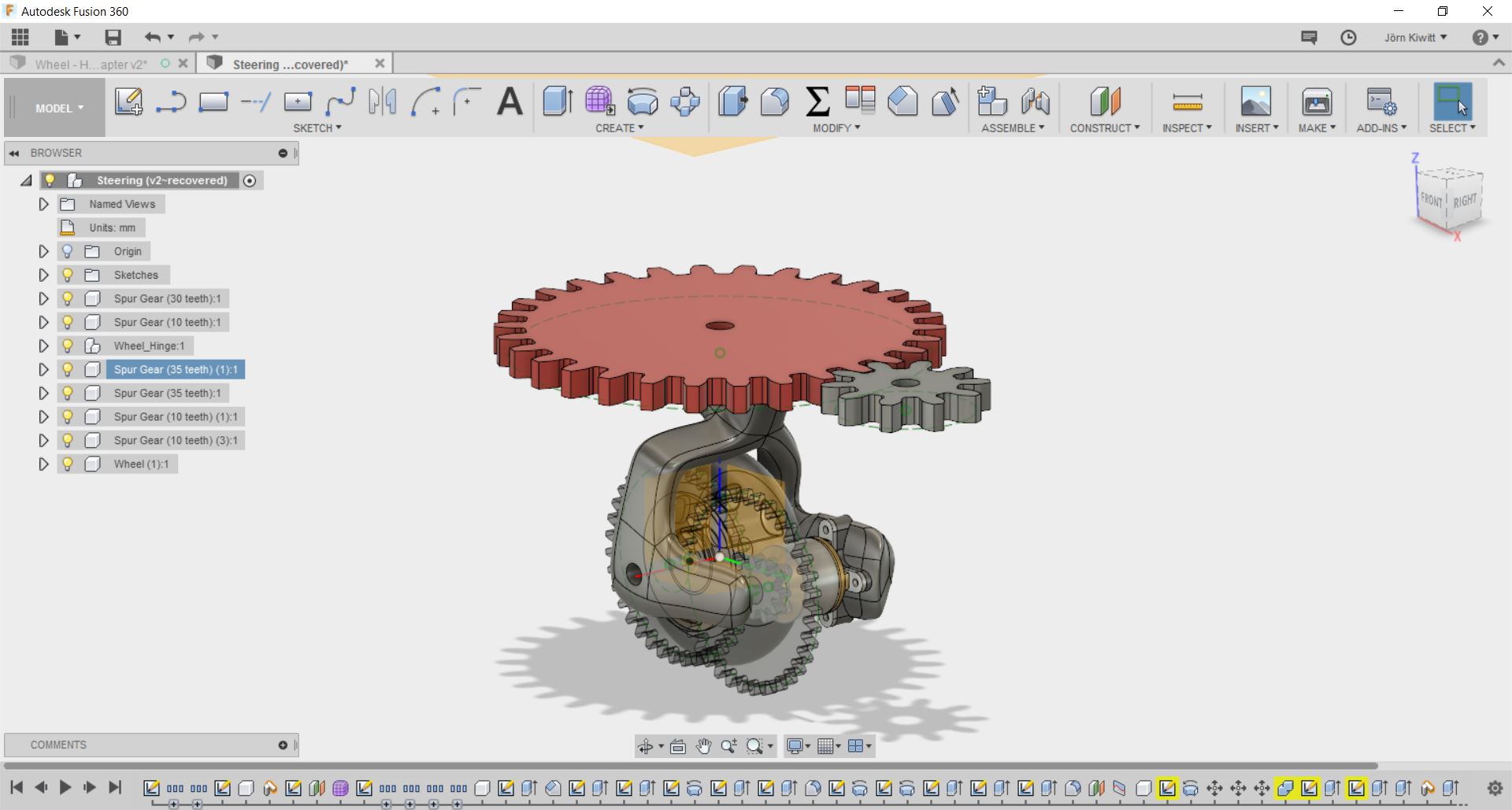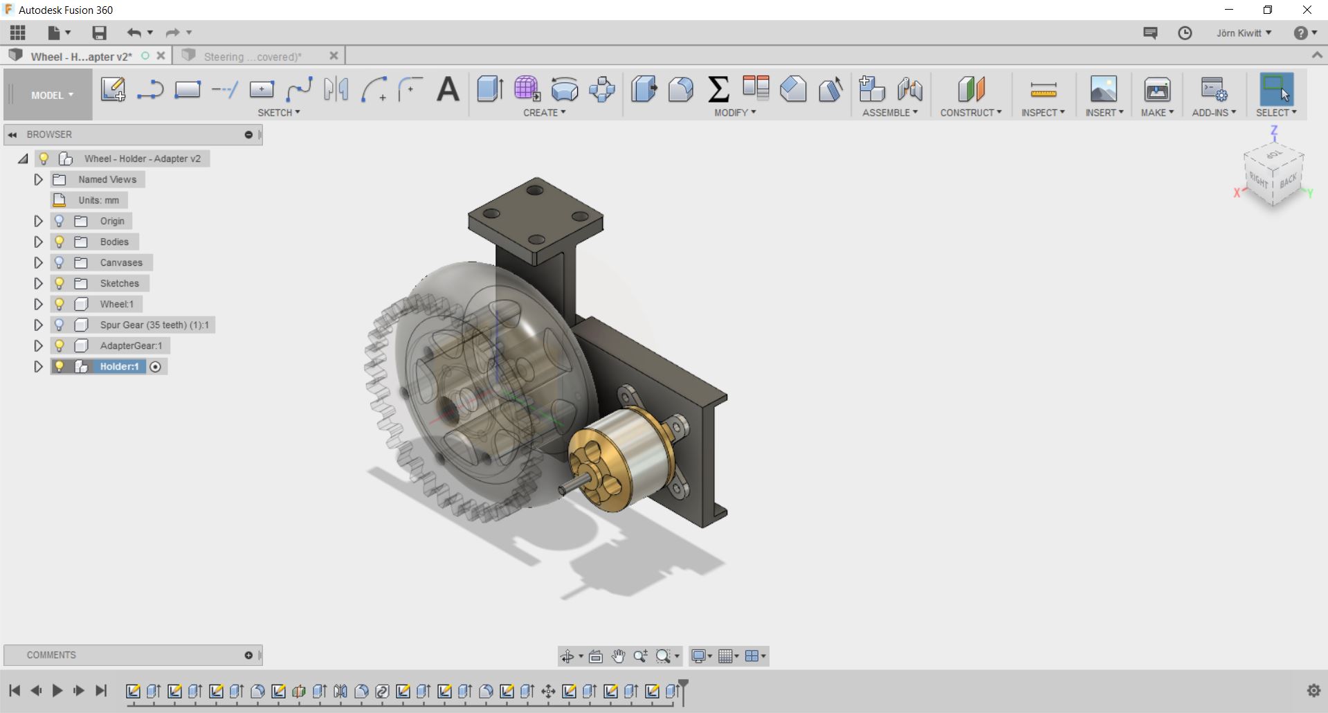 I finally decided to use acrylic gears of 6 mm thickness. The design was exported from Fusion 360 using the python script add-in SpurGear to generate the gear-wheel. Due to the size of the motor and wheel, I could not realize a very high transmission which turned out to be a downside. I used 100 % for power, 100 % for frequency and 6 % for speed on the laser cutter. Furthermore, small extensions from the gear-wheel were cut to fit into the slot of the wheels transmitting the torque.