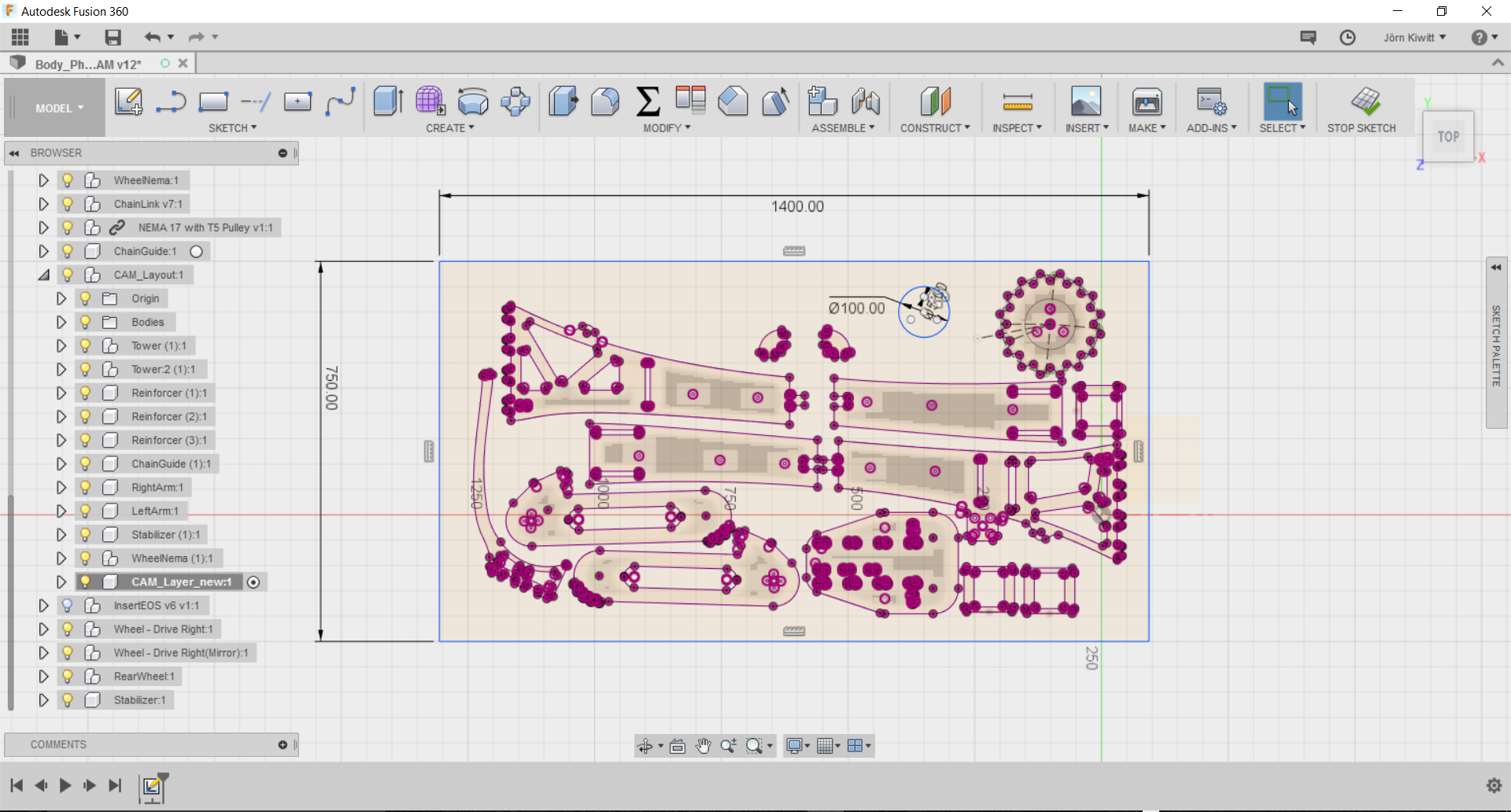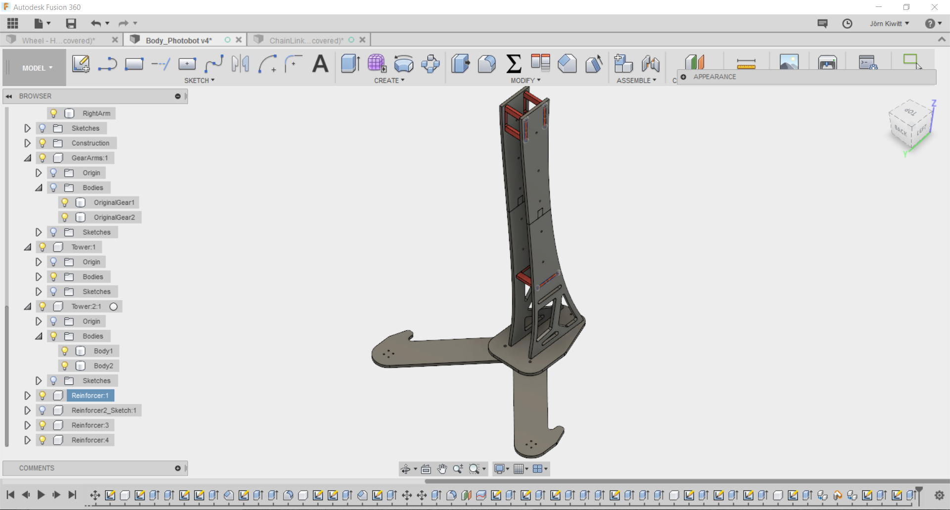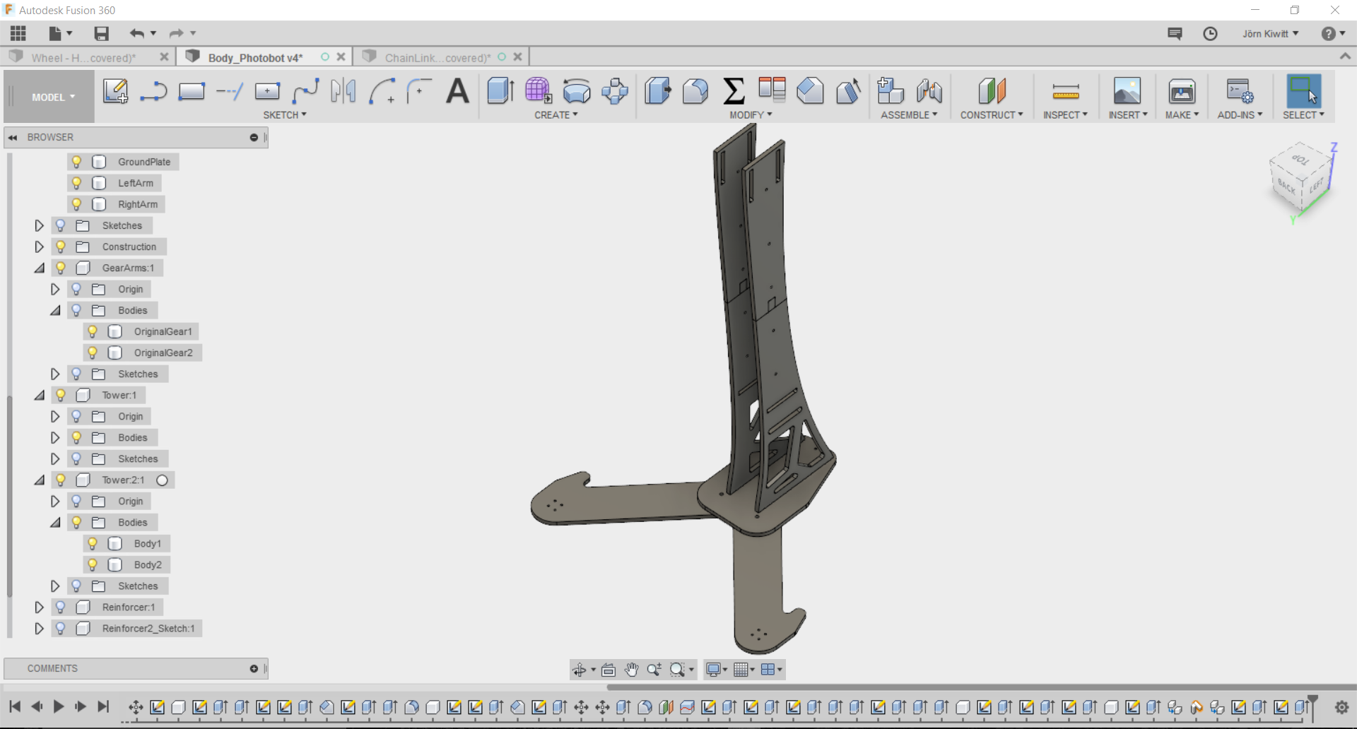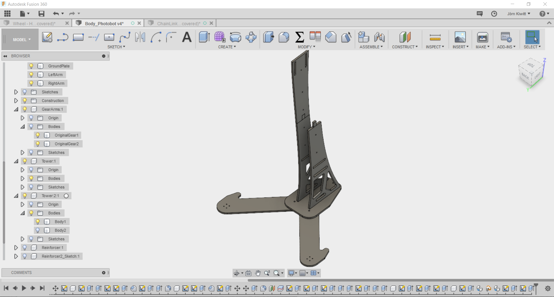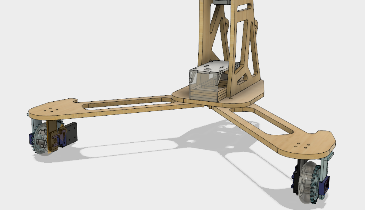 Here is my basic design for the bot's frame. The base, the so called drive module will hold the under carriage as well as electronics bay and support the tower. The tower carries the camera and contains the drawer rails as well as a stepper motor to extend it. The initial idea was to use a push chain to raise the camera, which was later replaced by threaded rod simular to the axis actuators of many CNC machines. To enable compact transportation, I split the design in half in z and the arms of the base are designed foldable.