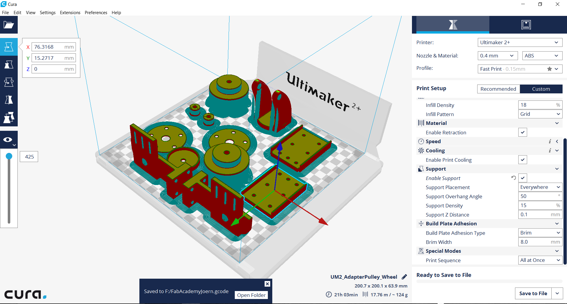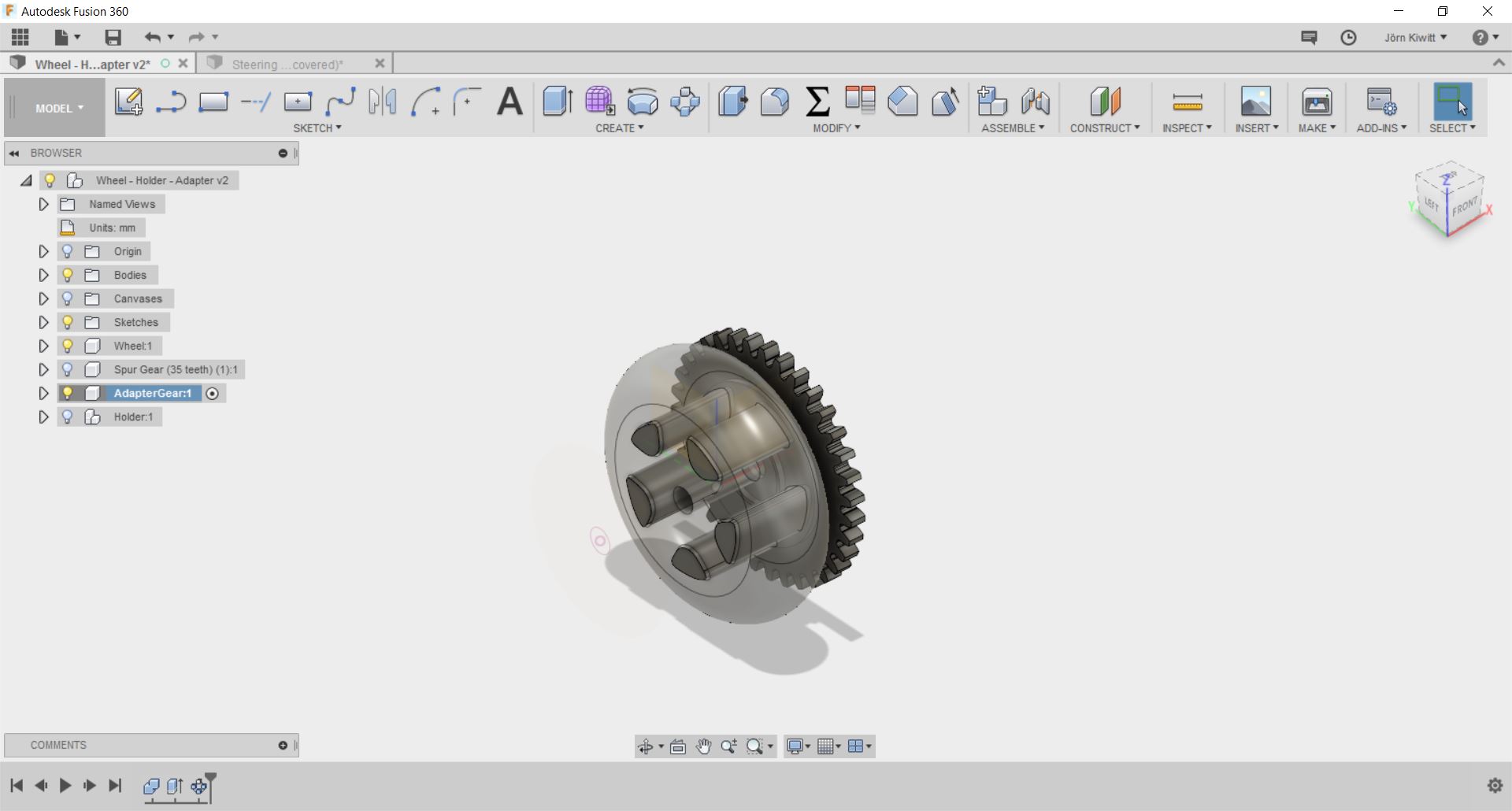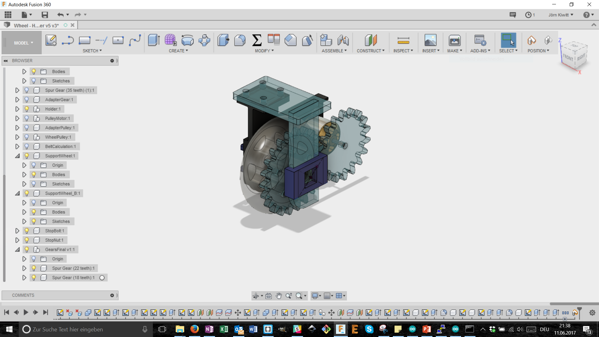 I finally decided to use acrylic gears of 6 mm thickness. The design was exported from Fusion 360 using the python script add-in SpurGear to generate the gear-wheel. Due to the size of the motor and wheel, I could not realize a very high transmission which turned out to be a downside. I used 100 % for power, 100 % for frequency and 6 % for speed on the laser cutter. Furthermore, small extensions from the gear-wheel were cut to fit into the slot of the wheels transmitting the torque.
