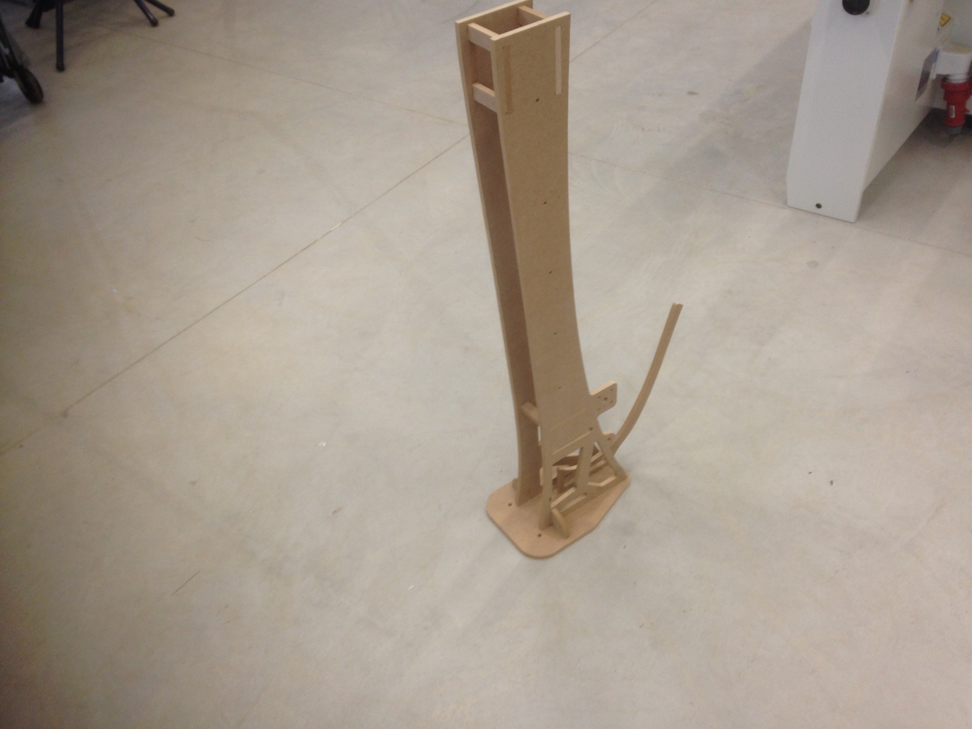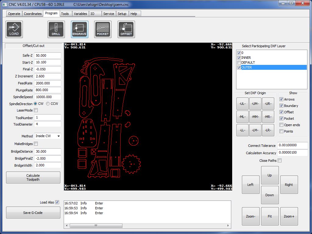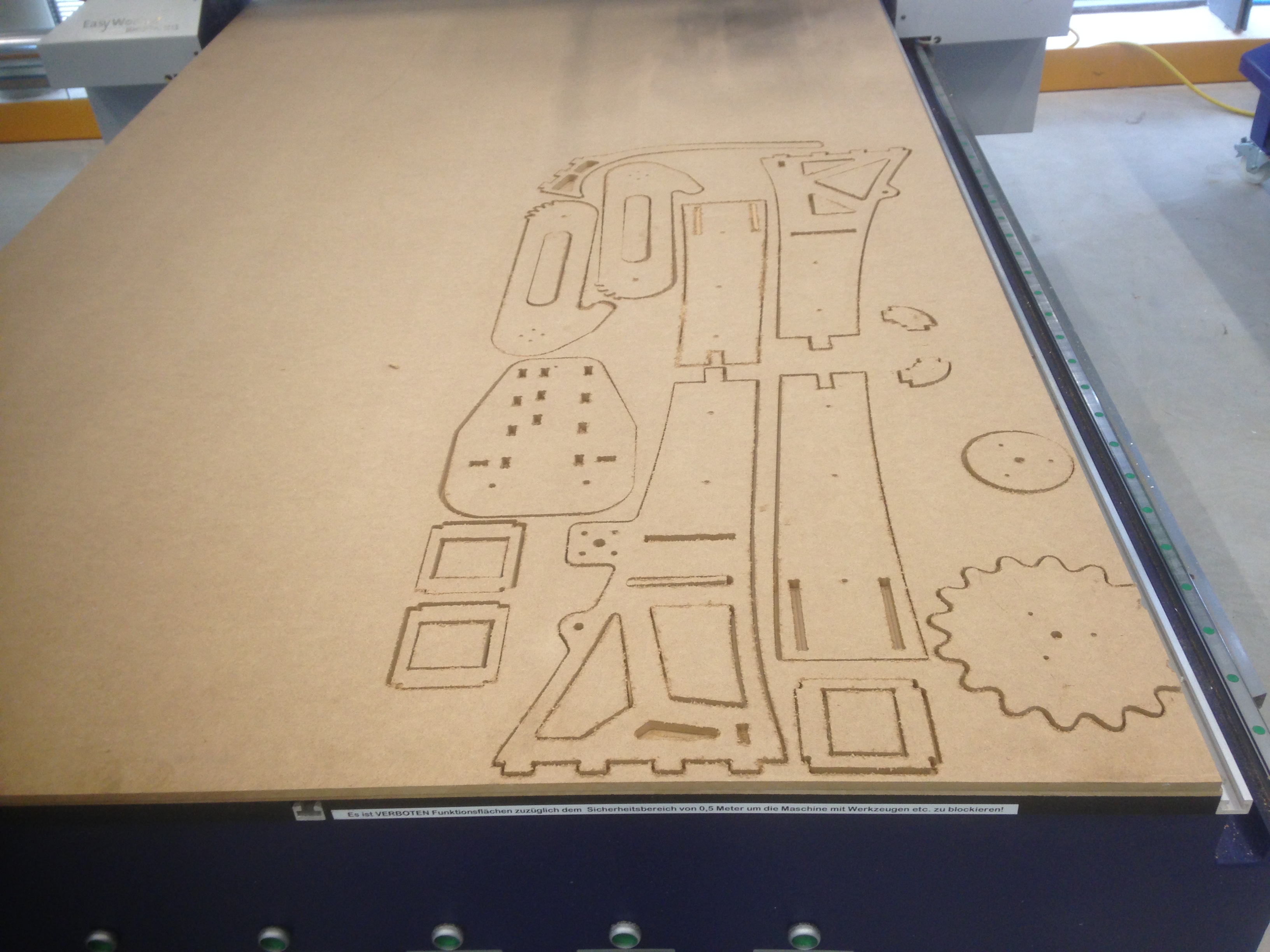 I made the frame using the EasyWorker CNC machine which I used earlier in the make something big assignment. All parts were laid flat using the align function in Fusion, projected a single sketch which was then exported to as *.dxf-file. Again, I took some tweaking in Rhino playing the explode and join function to account for all the doubles. I added to layers for the internal and the external cut and opened the file on the CNC machine. All settings can be retrieved from following images. Materialwise, I used MDF of 10 mm thickness.