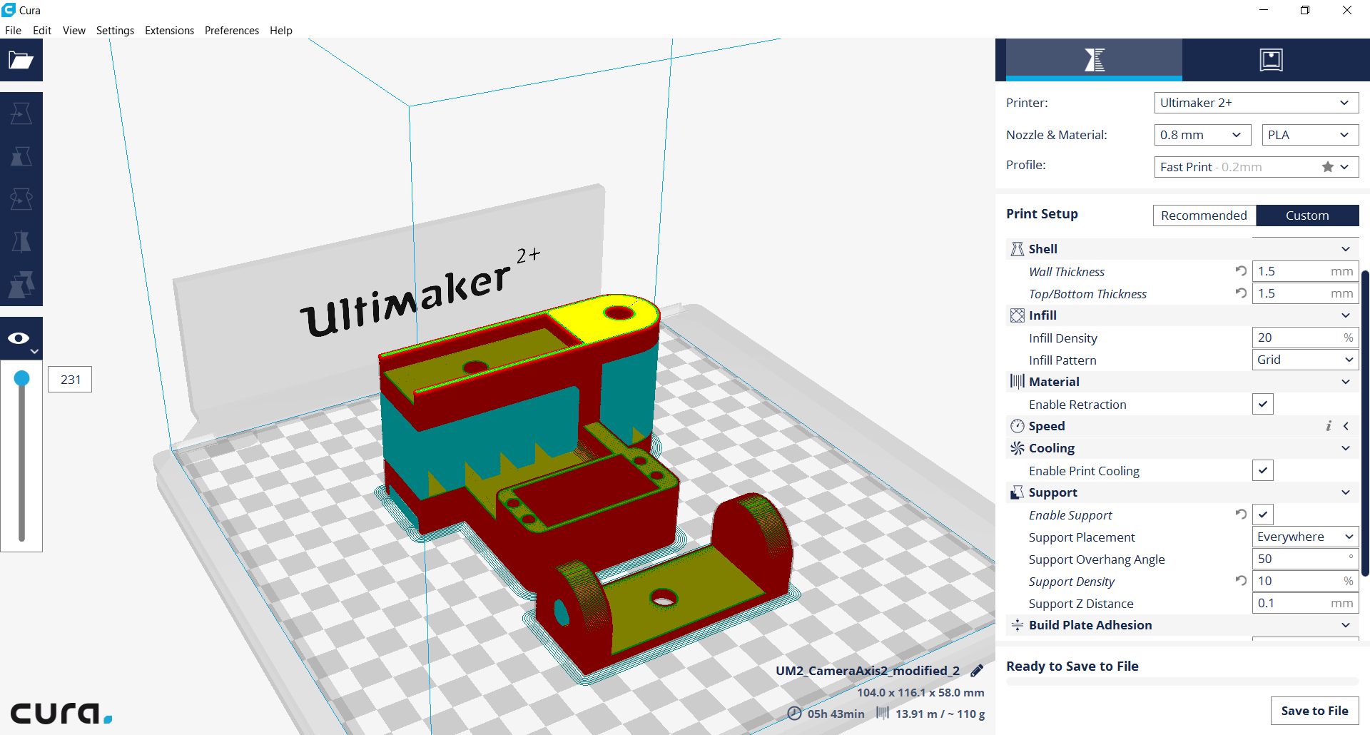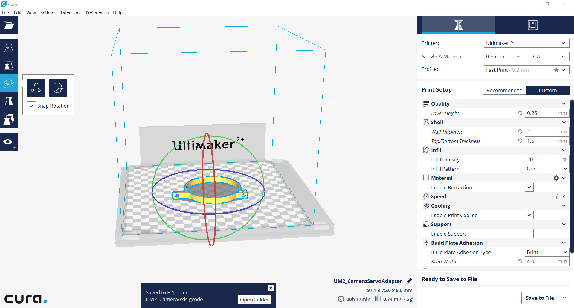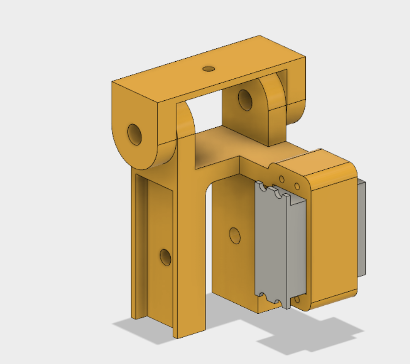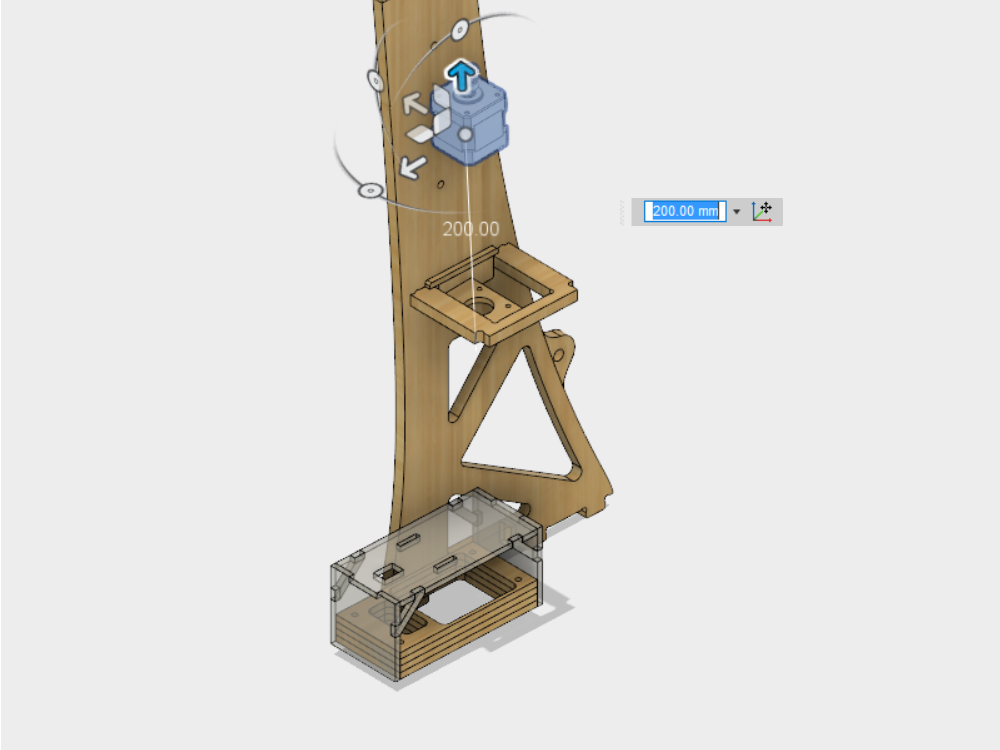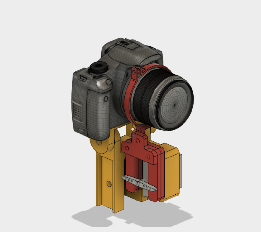 It had to make two iteration until the camera adapter fit nicely onto the guide rails. I used a simple laser cut design to build the connected using the servo housing as a guide rail for the pitch movement.
