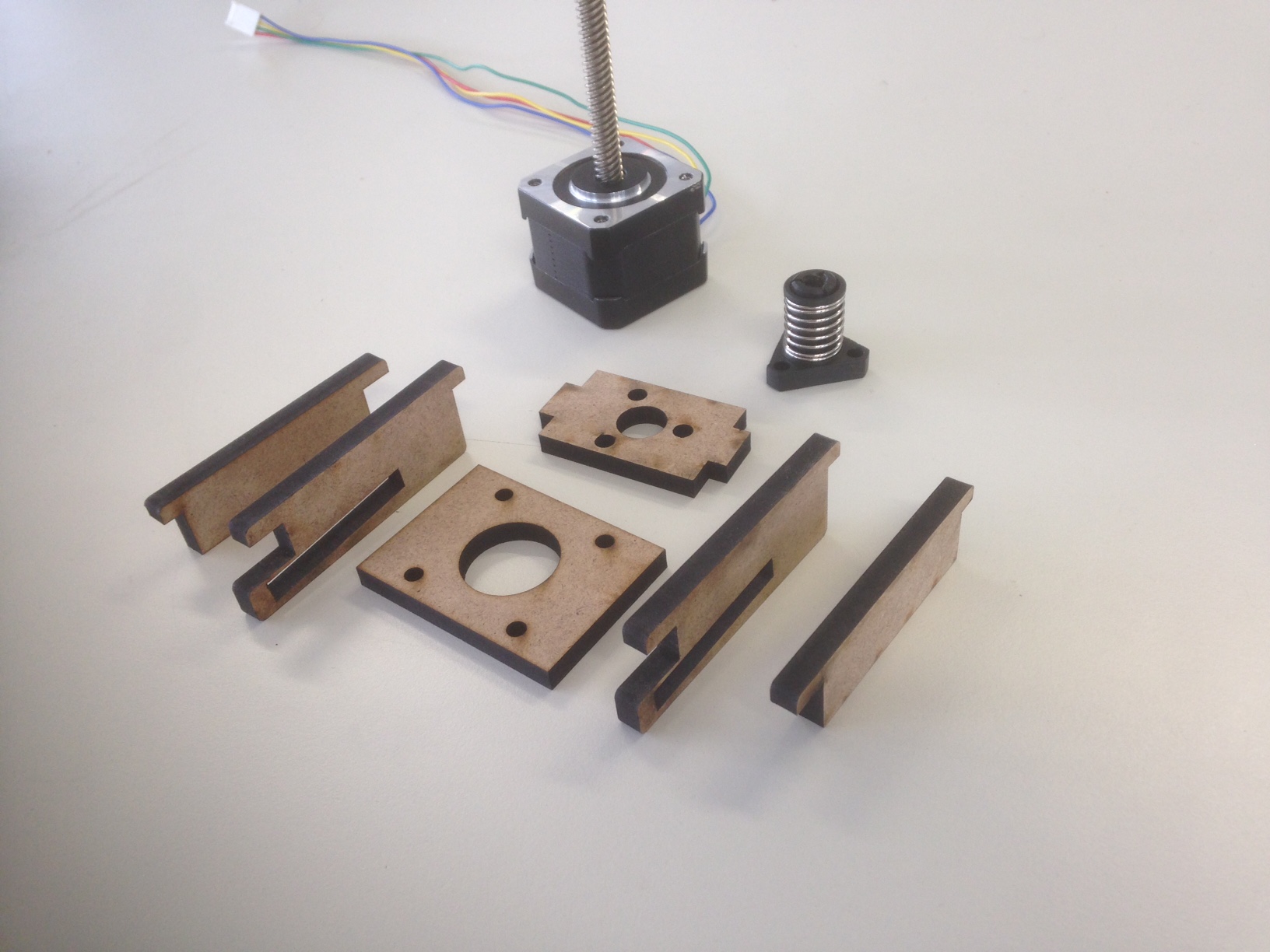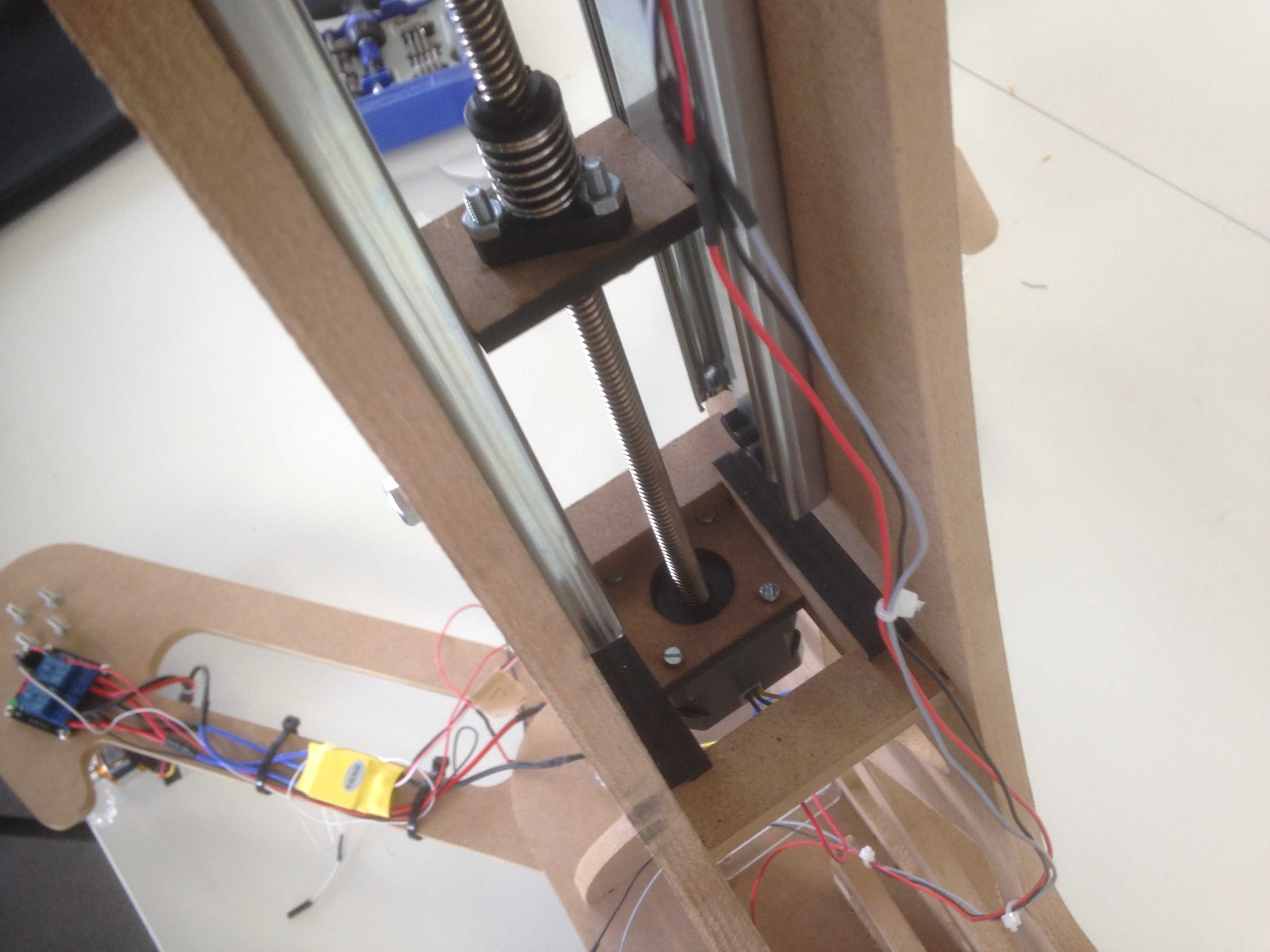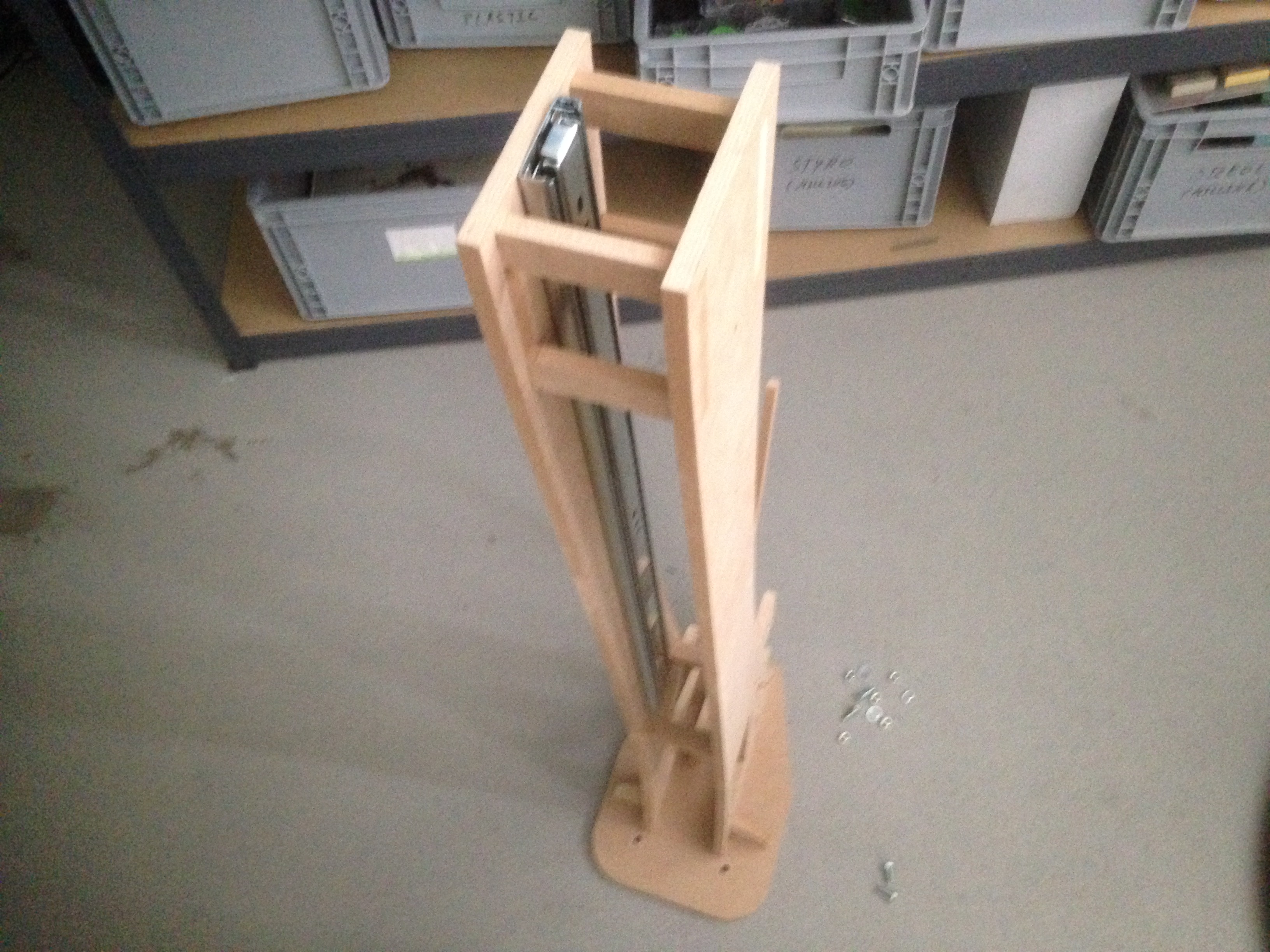 However, I never really came to implement this design, but went for a simpler one driven by a threaded rod with the stepper motor on the lower end. Suitable adapter were laser cut from 5 mm MDF. I used rails of a drawer to guide the movement. Fully extended, this would give an extra height of 70 cm but due to the limited rod length it only extended to around 30 cm so far.
