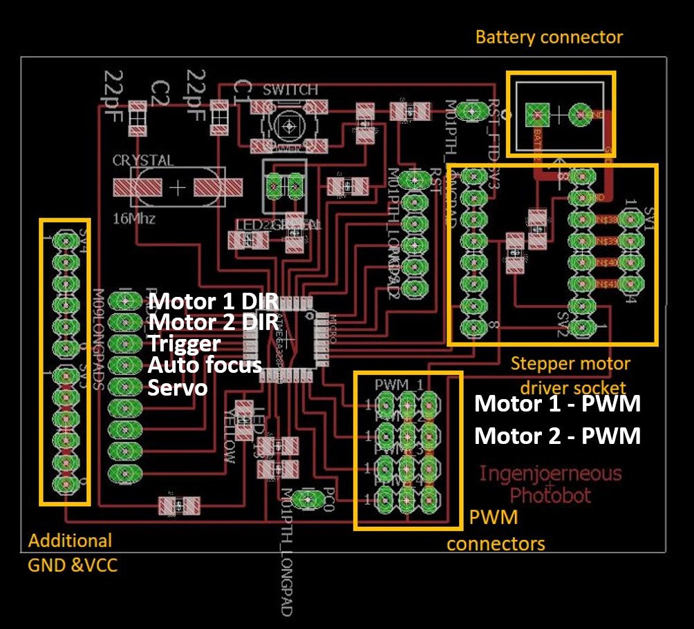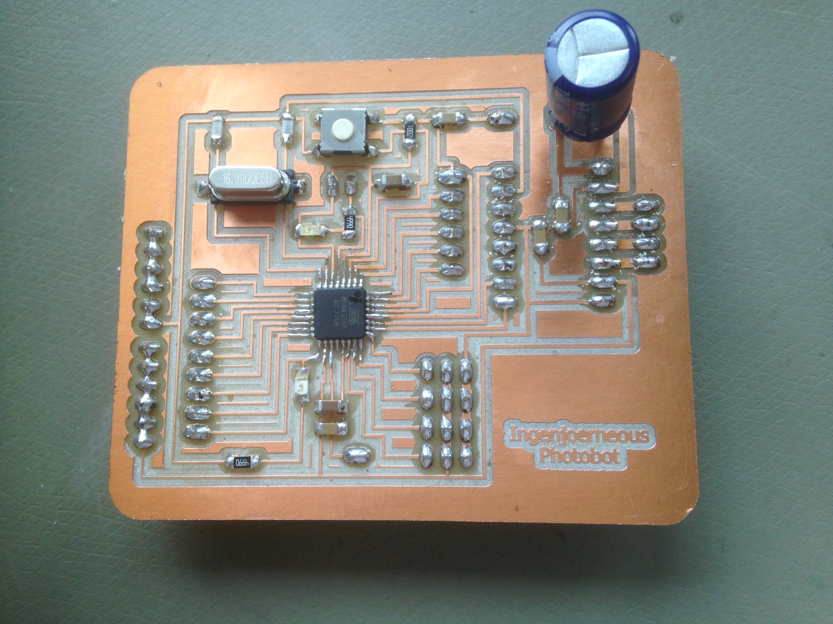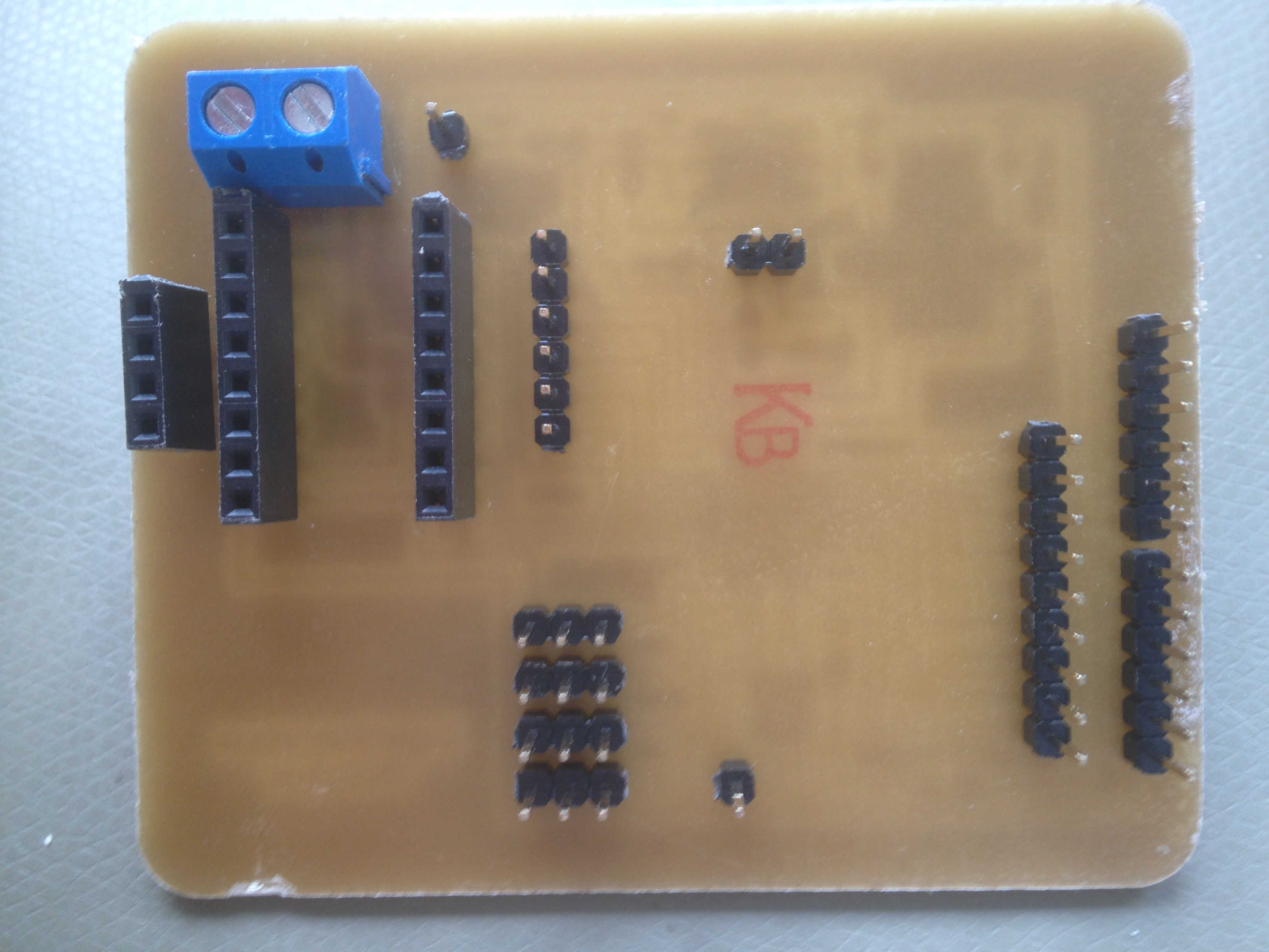 The microcontroller board also carries the Pololu stepper motor driver. As I burnt my board a week before the final presentation, I made a new one putting the female sockets to the bottom. More details can be found in the documentation of week 10.