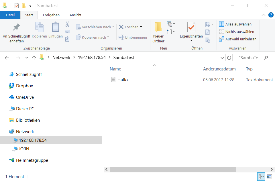 [global] workgroup = WORKGROUP security = user encrypt passwords = yes [SambaTest] comment = Samba-Test-Freigabe path = /home/shares/test read only = no browsable = yes