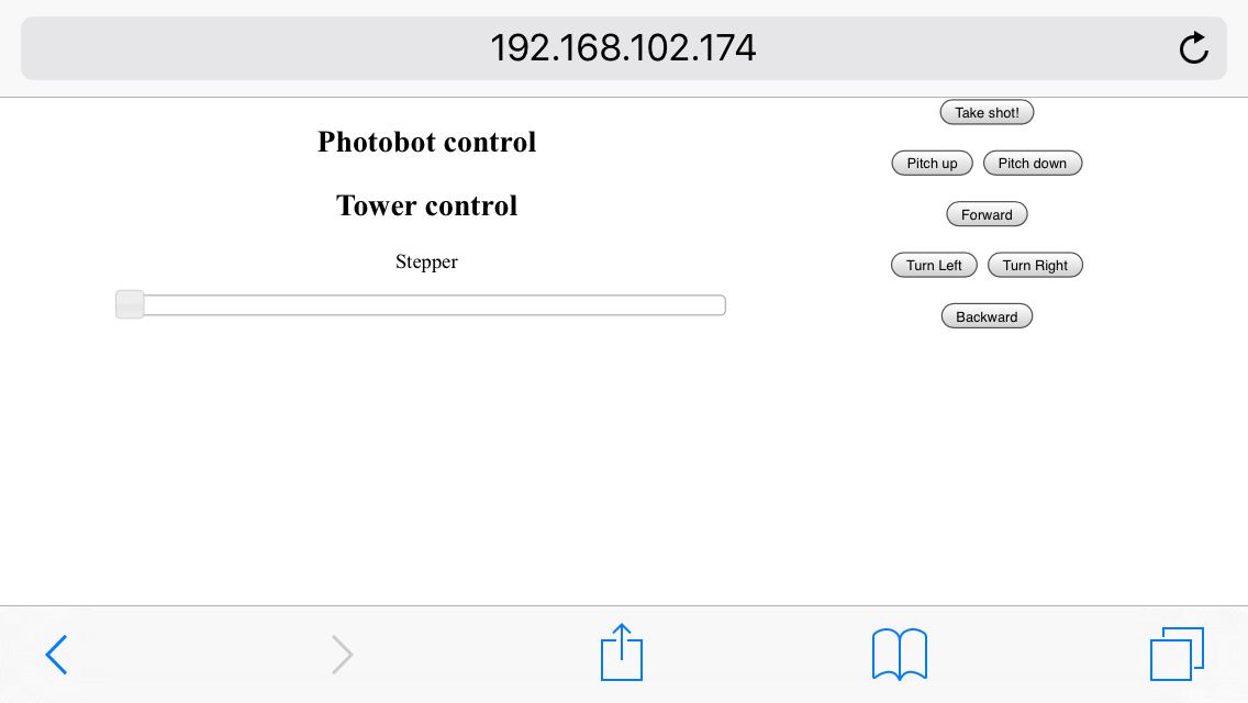$(document).ready(function() { // Camera trigger $('#check').click(function() { toggleVal += 1; toggleVal %= 2; iosocket.emit('Camera',toggleVal); }); // Pitch Up $('#pitchButtonUp').click(function() { pitchToggleVal = 1; iosocket.emit('Pitch',pitchToggleVal); }); // Pitch Down $('#pitchButtonDown').click(function() { pitchToggleVal = -1; iosocket.emit('Pitch',pitchToggleVal); }); // Turn right $('#ThrottleRightButton').click(function() { turnVal = 0; iosocket.emit('throttleLeft',turnVal); }); // Turn left $('#ThrottleLeftButton').click(function() { turnVal = 0; iosocket.emit('throttleRight',turnVal); }); // Forward $('#Forward').click(function() { turnBoth = -1; iosocket.emit('BothMotors',turnBoth); }); // Backward $('#Backward').click(function() { turnBoth = 1; iosocket.emit('BothMotors',turnBoth); }); });