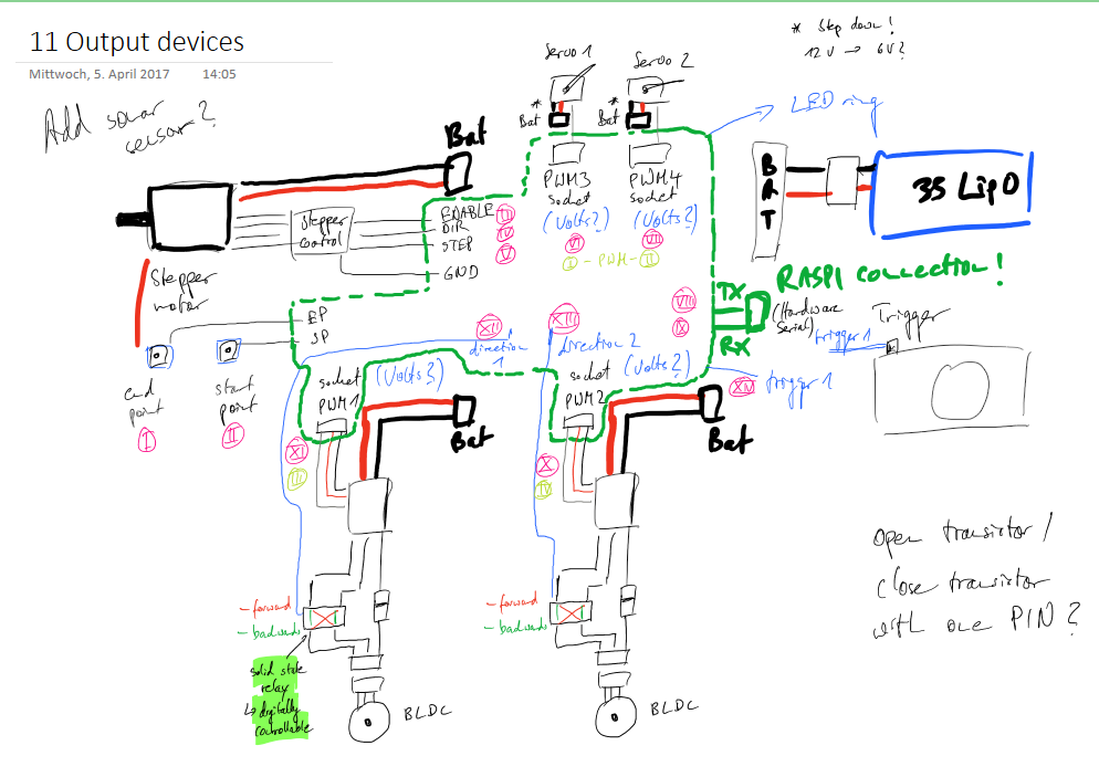 The bot will be controlled by a microcontroller board carrying the ATMega 328P. I will use three different output devices, two 2212 BLDC motors with 1000 kV, a stepper motor and 360 degree servo. The system will be powered by a 3S LiPo battery with high C-Rate. I have some 30C left, which I going to use. Of course, a higher capacity is also fine. Furthermore, I will need to integrate two ESCs for brushless motors as well as a board that distributes power to the output devices. To trigger the camera, a commercial wired remote control was hacked. The camera needs high levels on the auto focus and trigger to take a shot. Last but not least, I need a serial connection to the Raspberry pi which will be my WiFi receiver, hosting the Node JS server.